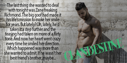 Shit. The last thing she wanted to deal with tonight was Zane freaking Richmond. The big goof had made it his life’s mission to make her smile for years. But lately? Oh, lately, he’d taken it a step further and the teasing had taken on more of a flirty tone. And now her heart went crazy every time he smiled her direction. Which happened way more than she wanted to admit. If he wasn’t her best friend’s brother, maybe… But after all that she and Talia had been through, endangering their friendship all for an uncertain relationship with Zane wasn’t something she was willing to chance.