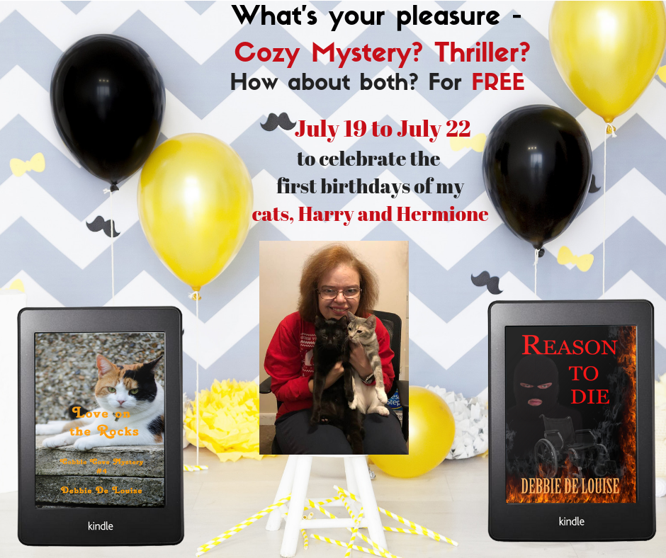 To celebrate Harry and Hermione’s first birthdays, you can get two of my books free, Love on the Rocks, my latest Cobble Cove cozy mystery, and Reason to Die, my mystery thriller. Both will be free Kindle ebooks on Amazon from Friday, July 19 to Monday, July 22.