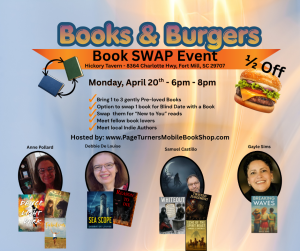 For those of you in the Indian Land/Fort Mill, SC area, I’ll be participating in the Books & Burgers event on Monday, April 20, with other local authors at the Hickory Tavern. Come by to chat with me, swap a book for Blind Date with a Book, and treat yourself to a half-off burger.